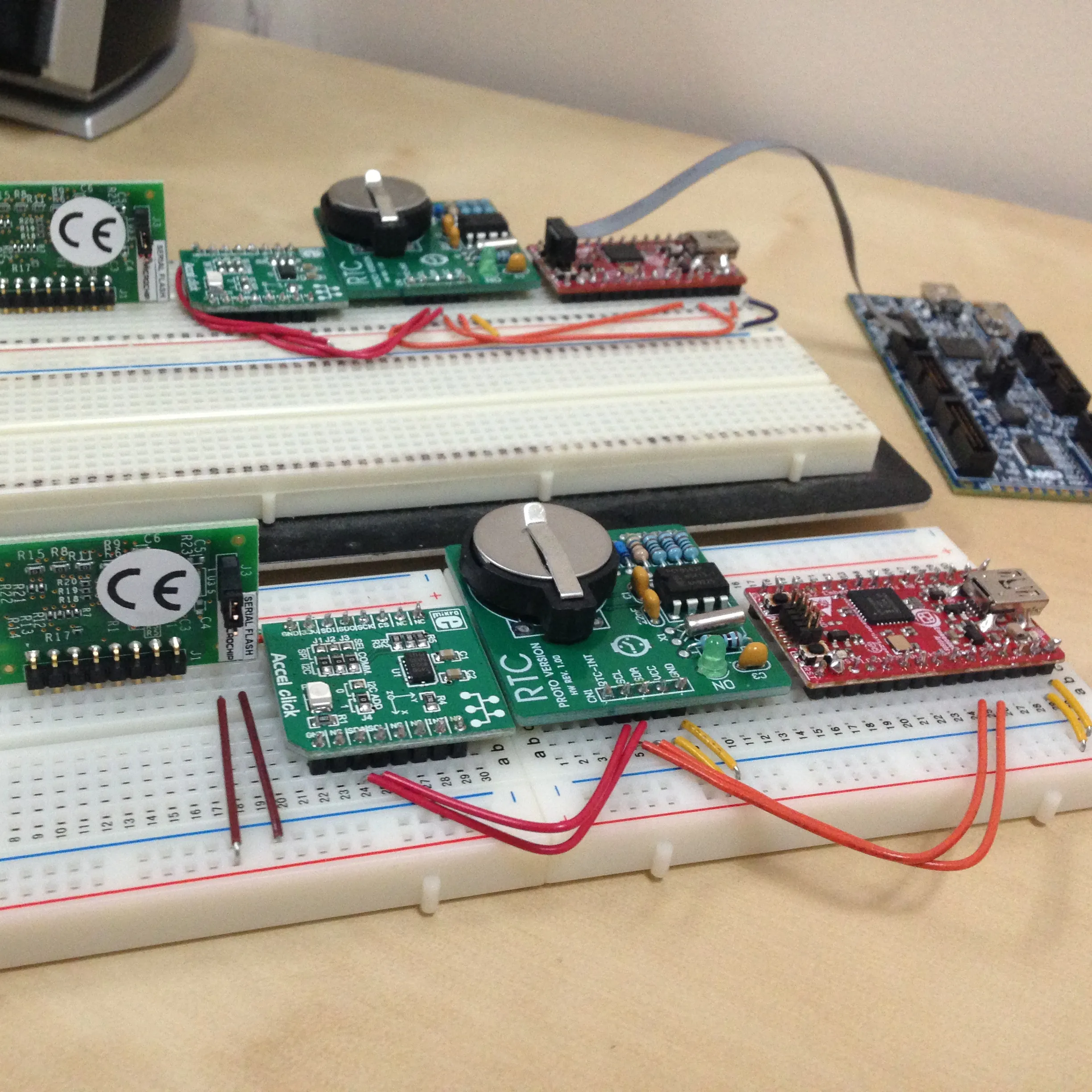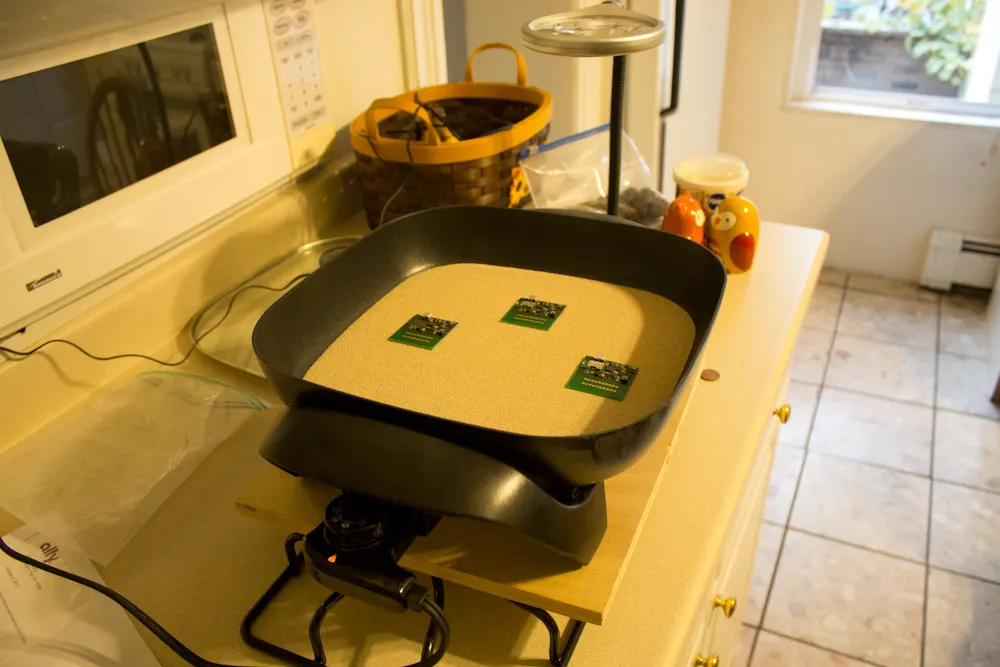 The first desktop prototypes were built using breadboards and evaluation boards to develop basic functionality while testing the performance of different hardware configurations. As the design was refined, I transitioned to short-run custom printed circuit boards. To save on production costs, I populated the boards myself, using solder paste stencils, tweezers and magnifiers to help me place components, and reflowing them with a cheap hotplate from Target with sand in the bottom to produce more even heating.